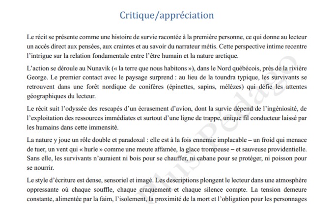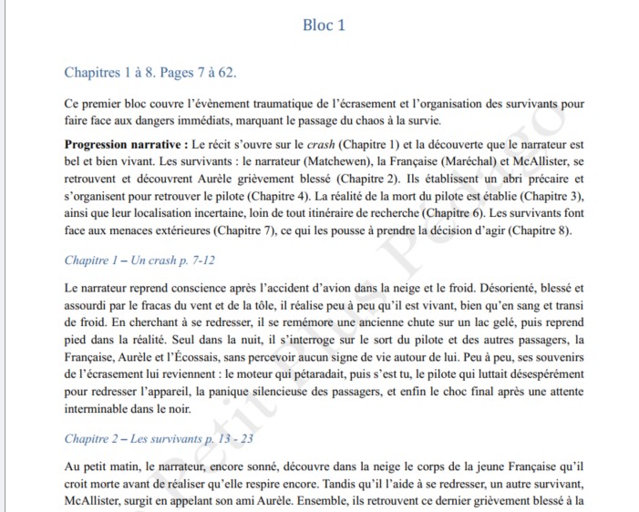 La lecture du roman est structurée en quatre blocs, suivant l’arc narratif du récit. Cette organisation permet aux élèves de mieux comprendre l’évolution de l’histoire, de la survie immédiate après la catastrophe jusqu’à la résolution finale. Chaque bloc met en lumière les enjeux narratifs, humains et relationnels du roman.