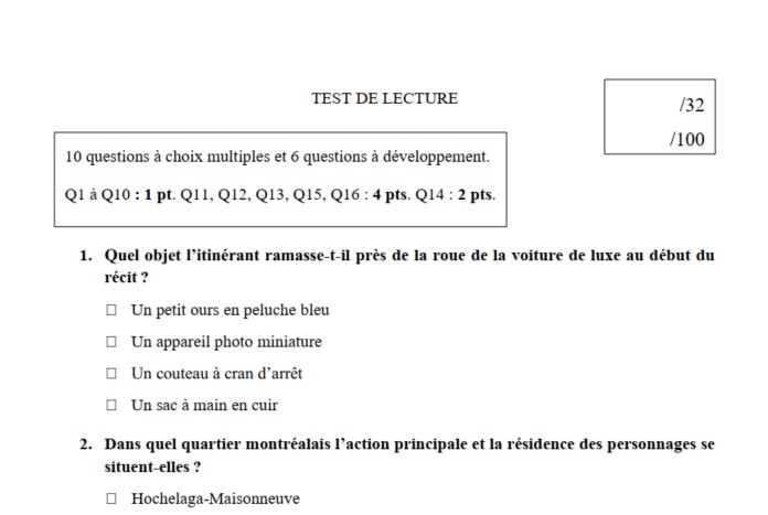 Évaluez efficacement la compréhension de vos élèves avec ce test de lecture. Ce dernier combine 10 questions à choix multiples et 6 questions ouvertes qui sollicitent l’analyse, l’interprétation et la justification à partir du texte.